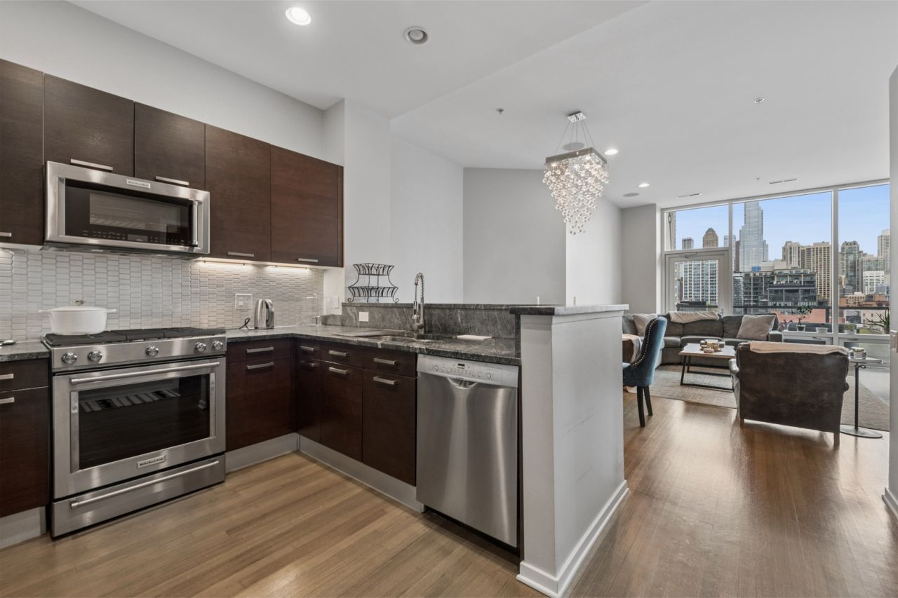 Rarely available, this exceptional residence offers breathtaking city views from a private, east-facing balcony in the heart of River North. Designed with both elegance and comfort in mind, the expansive open-concept layout is ideal for sophisticated entertaining, featuring rich hardwood flooring throughout and a chef-inspired kitchen appointed with premium stainless steel appliances, granite countertops, a designer tiled backsplash, and an inviting breakfast bar. The serene primary suite serves as a true retreat, complete with a refined office nook, two spacious walk-in closets, and a spa-caliber marble bath featuring a linen closet, dual vanities, a whirlpool soaking tub, and a separate glass-enclosed shower. Additional upscale amenities include built-in speakers, an in-unit washer and dryer, and a dedicated storage locker, offering the perfect blend of luxury, convenience, and urban living. Garage parking additional 35k. Pet friendly - 2 pets per unit with no weight or breed restrictions. Parking space P-249 on 2nd floor. Assessments listed include parking.